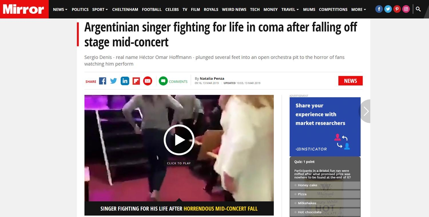 Esta vez, los informantes británicos publicaron en sus plataformas digitales sobre el accidente del cantante Sergio Denis, quien durante su presentación en el teatro Mercedes Sosa cayó del escenario y tuvo que ser hospitalizado de urgencia.