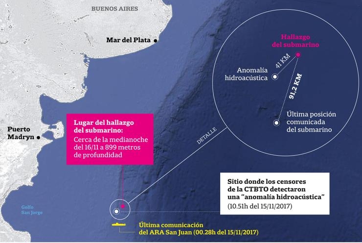 "No se hizo todo porque llevaba mucho tiempo y no era necesario. La empresa hizo un área de barrido muy grande de un kilómetro de ancho por un kilómetro de largo tomando como centro el lugar donde está el submarino. Antes de comenzar a procesar los sonidos, se pusieron de acuerdo los peritos de que la zona a mapear fuera de 160 metros por 160 metros", precisó.