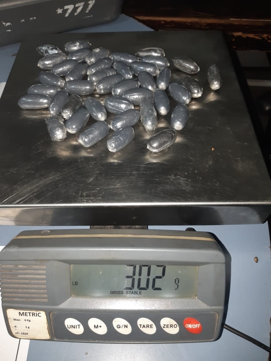 Ante la presencia de testigos, el personal policial le realizó una inspección completa y halló en su ropa interior 40 cápsulas de látex conteniendo una sustancia en polvo. Las mismas, sometidas a pruebas de campo, dieron positivo para clorhidrato de cocaína, arrojando un peso de 302 gramos. Luego el pasajero, cantante de una conocida banda de cumbia, dijo que había ingerido 70 envoltorios por lo cual se los trasladó al Hospital Fernández.