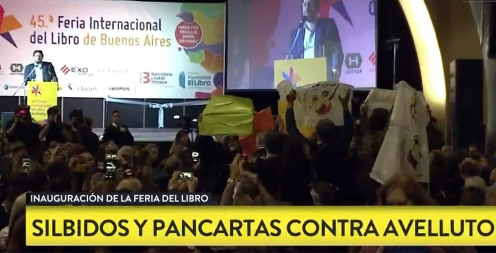 La presidenta de la Fundación el libro volvió a subir al escenario y tomo el micrófono para pedir que dejaran hablar a Avelluto. Hubo abucheos, pero Avelluto continúo con su discurso. Así, mientras sobre el escenario hablaba el secretario de Cultura, en el fondo de la sala Jorge Luis Borges seguían los reclamos y gritos de los jóvenes con carteles y una bandera con la sigla CEIP.