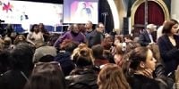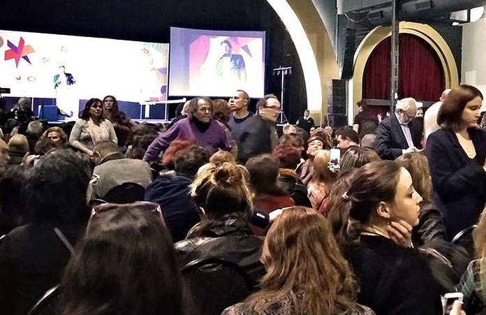Parte del público, en especial los ubicados al fondo, comenzaron a aplaudir para apoyar la irrupción de los jóvenes. Algunos, incluso, aplaudían de pie dando la espalda al escenario, donde Avelluto seguía hablando.