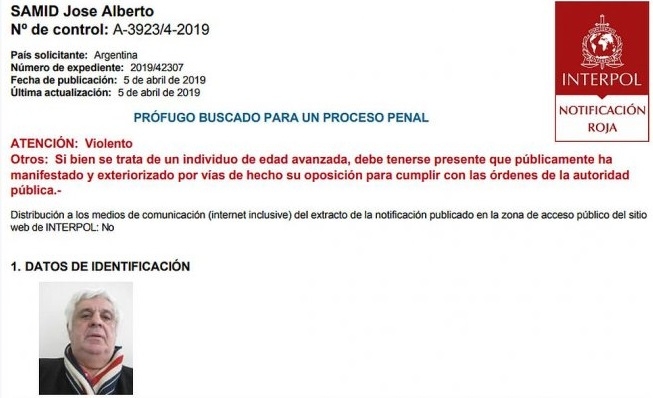 "El buscado formaba parte de la cúpula de una organización delictiva, siendo Samid uno de los elementos más preponderantes de esa asociación Ilícita, que por intermedio de varios frigoríficos destinados a la venta de alimentos vacunos, y luego de la venta de los mismos, dicha organización retenía los impuestos que debían ser aportados a las arcas del Estado Nacional", explica la circular de Interpol.