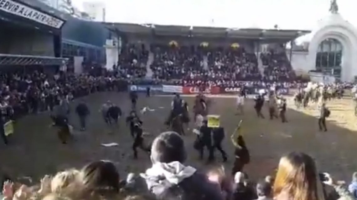 La tensión duró unos minutos mientras los silbaban desde las tribunas. Luego aplaudieron cuando los gauchos con sus caballos los empezaron a echar de la plaza.