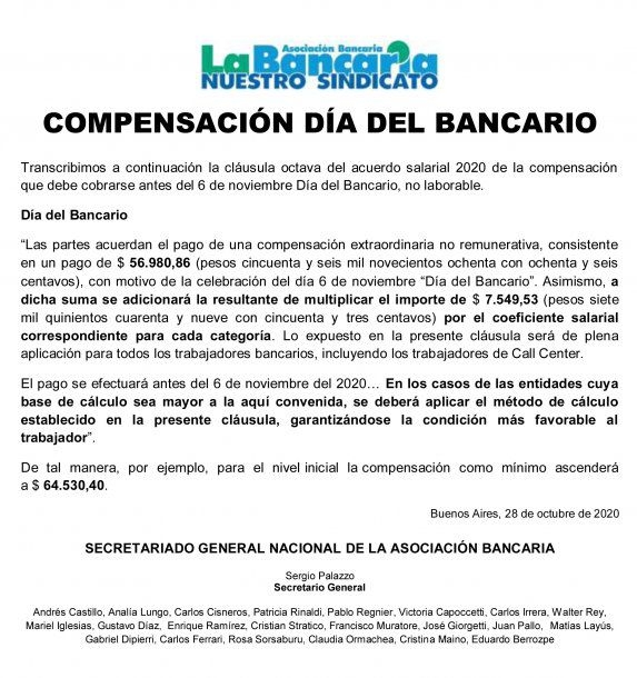 La cláusula octava del acuerdo salarial 2020 determinó que esa compensación por el "Día del Bancario" implica el pago de 56.980,86 pesos, informaron hoy en un comunicado de prensa los dirigentes Sergio Palazzo y Eduardo Berrozpe.
