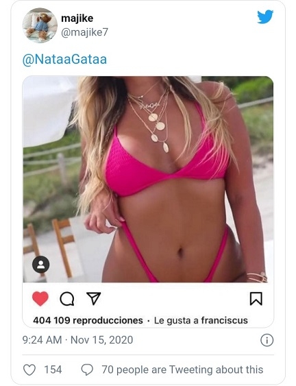 Alguno de los 2,2 millones de seguidores en Instagram de la modelo, más conocida como Nata Gata, la alertó del ‘me gusta’ a través de Twitter, a lo que la brasileña reaccionó irónicamente: «Al menos me voy al cielo».