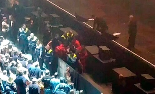 Sabina, que fue llevado en camilla fuera del escenario, sufrió un fuerte golpe en el hombro y, tras ser revisado por los médicos del recinto, salió de vuelta para despedirse del público y pedir disculpas por la cancelación.