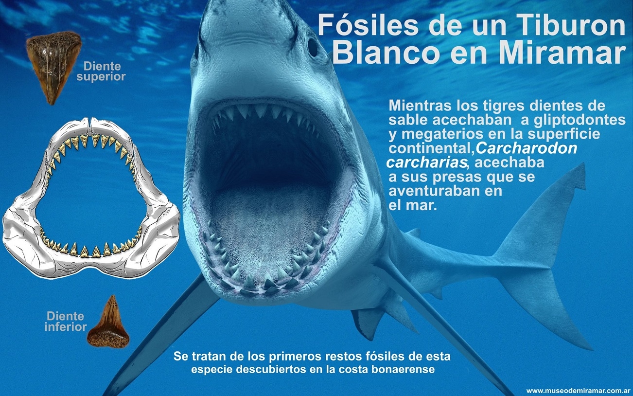 El tiburón blanco, es una especie rara vez registrada en el mar argentino. Hace unos días fue identificado en el registro paleontológico de la ciudad de Miramar, a partir de dos dientes depositados en las colecciones científicas del Museo de Ciencias Naturales de esa ciudad, ubicada a unos 450 kilómetros de Buenos Aires.