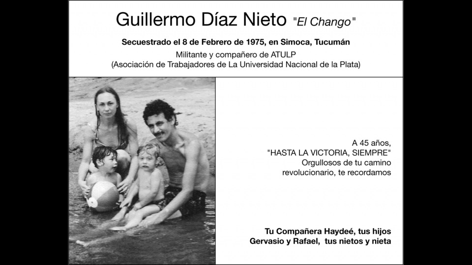 La causa por la desaparición del “Chango” Díaz Nieto, a los 27 años de edad, fue iniciada por su madre, María Esther Nieto. El calvario de la familia, incluyó además el secuestro y tortura de su padre, Mardonio Rafael Díaz Martínez, quien en la frustrada misión de conocer el paradero de su hijo perdió la vida a los 59 años de edad.