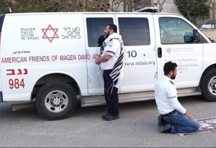 Sin embargo, en tiempos de coronavirus, una foto de dos enfermeros que oran ante su ambulancia se ha vuelto viral: uno, judío, reza en dirección a Jerusalén; el otro, musulmán, está arrodillado en una alfombrilla de oración y lo hace hacia La Meca.