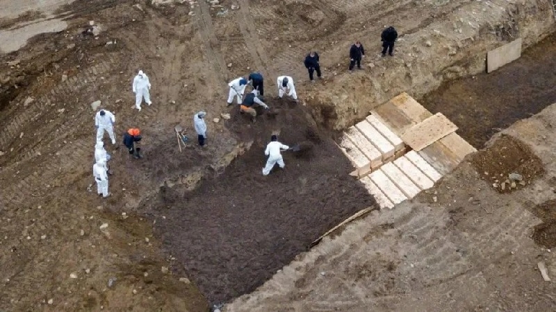 Imágenes grabadas con un dron dejan ver a varios trabajadores vestidos con trajes blancos de protección usando una escalera para descender a una enorme fosa donde se apilan los ataúdes. También se ve un camión refrigerado en el que hay cerca de dos docenas de cuerpos.
