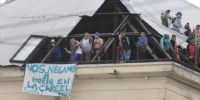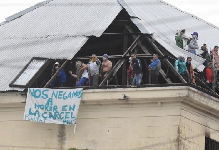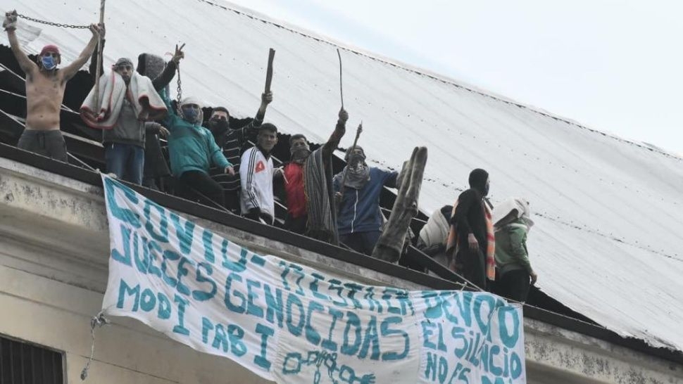 Los internos que participaban de la protesta lograron quitar algunos chapones y podían verse en los techos con banderas de reclamo y algunos de ellos armados con facas.