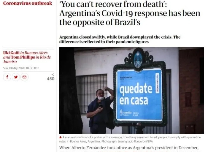 "Cinco meses después, es Brasil el que se dirige hacia una emergencia humanitaria, en medio de un devastador brote de coronavirus impulsado por la actitud despectiva de Bolsonaro hacia la pandemia", dijo el matutino británico, que remarcó también "la estrecha coordinación" entre el gobierno nacional argentino, los gobernadores y los intendentes para administrar la cuarentena obligatoria y marca como un fuerte "contraste" el hecho de que, en Brasil en cambio, Bolsonaro "despidió a su ministro de Salud y se enfrentó con los gobernadores regionales'.