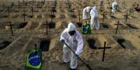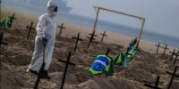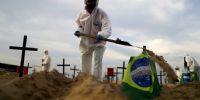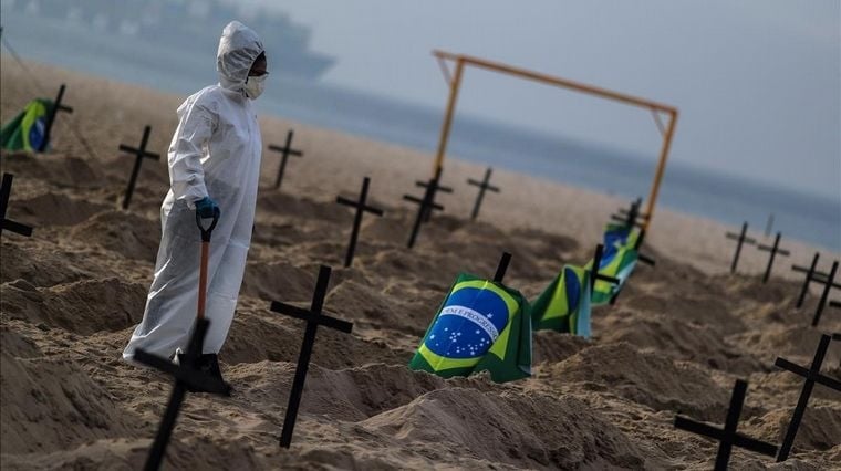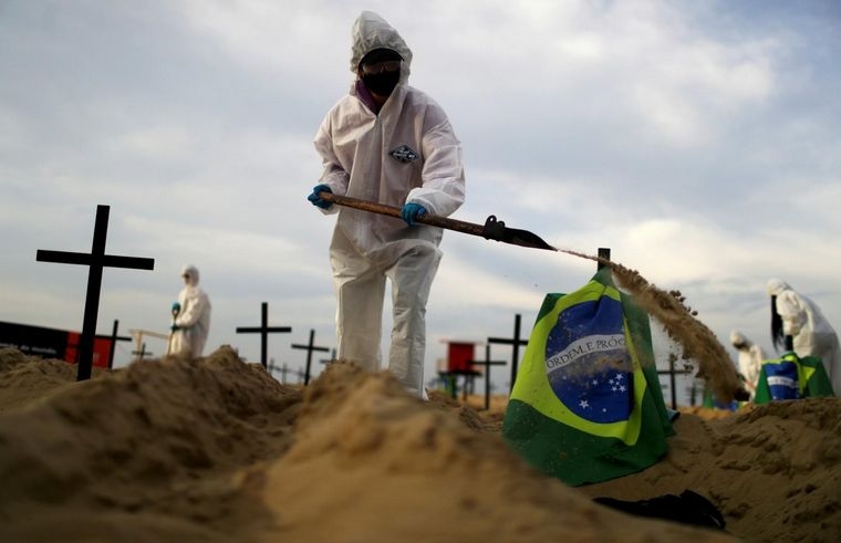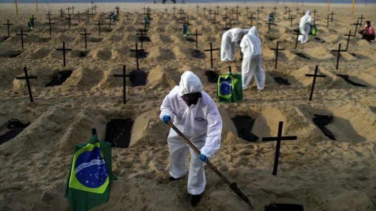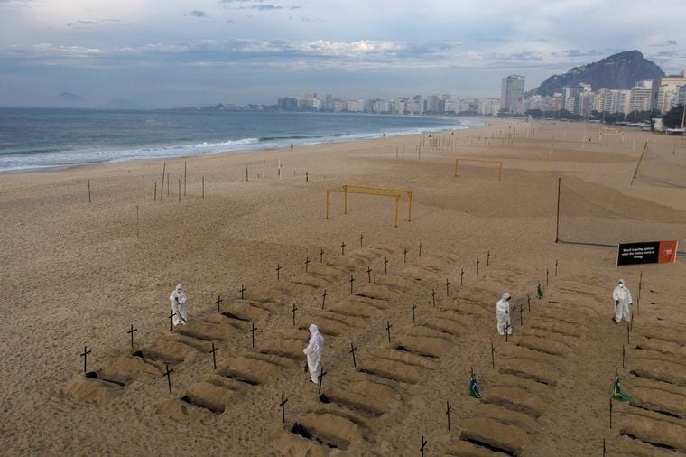 Activistas brasileños cavaron este jueves un centenar de tumbas en la playa de Copacabana, uno de los principales puntos turístico de Río de Janeiro, en una acción de protesta contra la política oficial del gobierno de Jair Bolsonaro frente a la pandemia de coronavirus, en el país en el que se espera que los muertos por Covid-19 superen los 40.000.