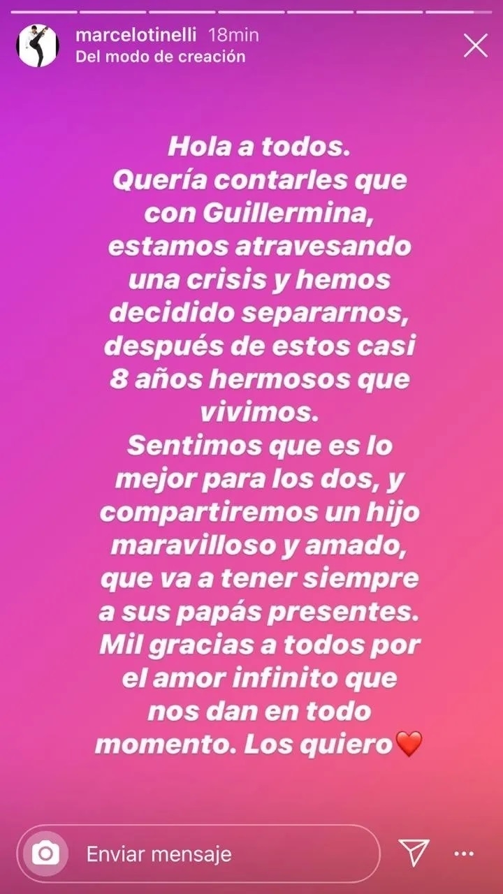 "Hola a todos. Quería contarles que con Guillermina estamos atravesando una crisis y hemos decidido separarnos después de estos casi ocho años hermosos que vivimos", anunció este domingo por la mañana Marcelo Tinelli en su cuenta de Instagram para confirmar su ruptura con la modelo.