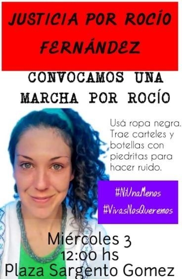 Finalmente, amigos y vecinos de la joven realizarán a las 12 de este miércoles una marcha en la Plaza Sargento Gómez para pedir justicia por Rocío, y la consigna es traer una remera negra, carteles y botellas con piedritas adentro para "hacer ruido", con el #Niunamenos y #Vivasnosqueremos.