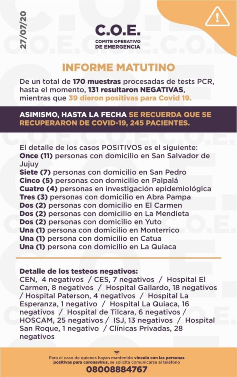 El Comité Operativo de Emergencia (COE) informó a través de su reporte matutino que en las últimas horas se detectaron 39 nuevos casos en Jujuy. De esta manera los números de contagios llegan a un total de 1667. No se registraron nuevas muertes.