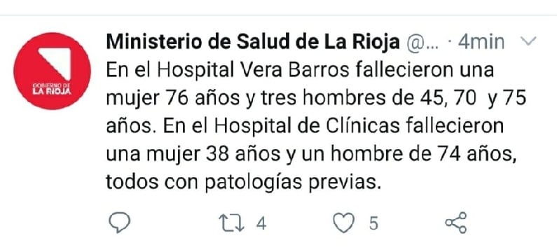 A todo esto, el Comité Operativo de Emergencias (COE) del Departamento Chamical informó que uno de los decesos es el caso de una mujer de 38 años, oriunda de la cabecera departamental mencionada, con patologías previas, en el Hospital Universitario o de Clínicas.