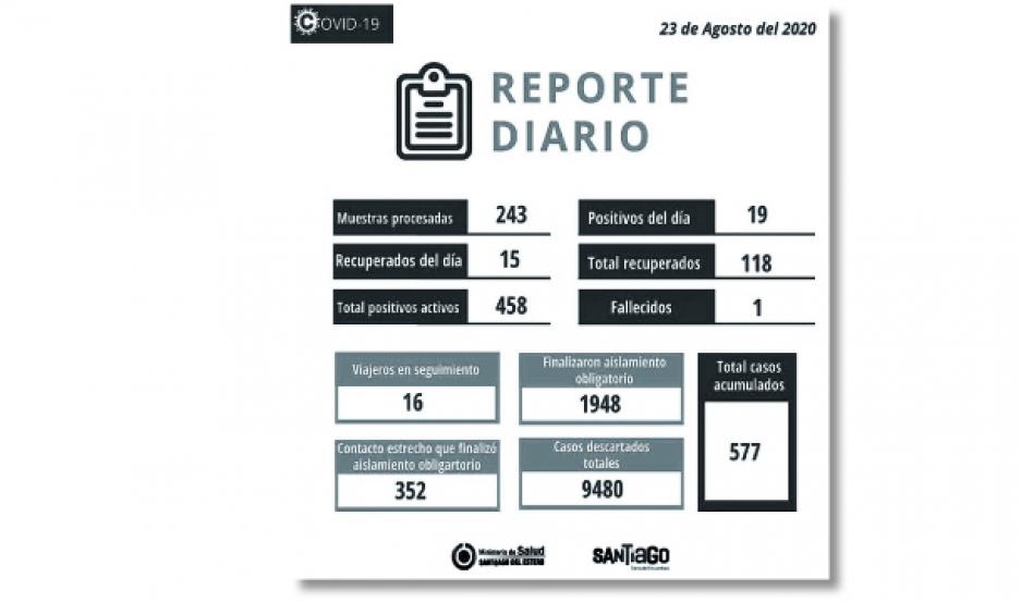 Este domingo, se recuperaron 15 casos confirmados, por lo que son 118 los casos recuperados en la provincia, a la vez que se confirmaron 19 casos, uno en Icaño, uno en Beltrán, uno en Colonia Dora, dos en Fernández, tres en Añatuya, once de Capital y Banda; por lo que permanecen activos 458 casos en la provincia.