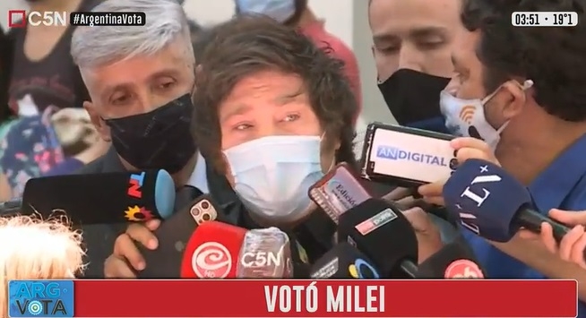 El candidato a diputado nacional por la ciudad de Buenos Aires, Javier Milei, emitió su voto alrededor de las 11.30 en la sede de la UTN (Universidad Tecnológica Nacional) de la avenida Medrano al 951, del barrio de Almagro. Al salir, hizo declaraciones sobre el contexto económico del país y señaló que “la situación de la Argentina es extremadamente delicada”.