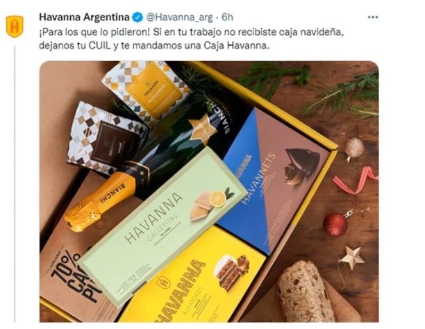 A las 9.54, Havanna publicó en su cuenta de Twitter un mensaje ofreciendo sus productos: “¡Para los que lo pidieron! Si en tu trabajo no recibiste caja navideña, dejanos tu CUIL y te mandamos una Caja Havanna.” Las respuestas con los números de CUIL no se hicieron esperar y llegaron masivamente. Más de 2 horas después, a las 12.21, la amable oferta se transformó en un chiste del 28 de diciembre y un nuevo tuit lo dijo: “¡Feliz día de los inocentes! Ahora en serio. Entre los copados que participaron, ¡vamos a sortear 5 Cajas!”.