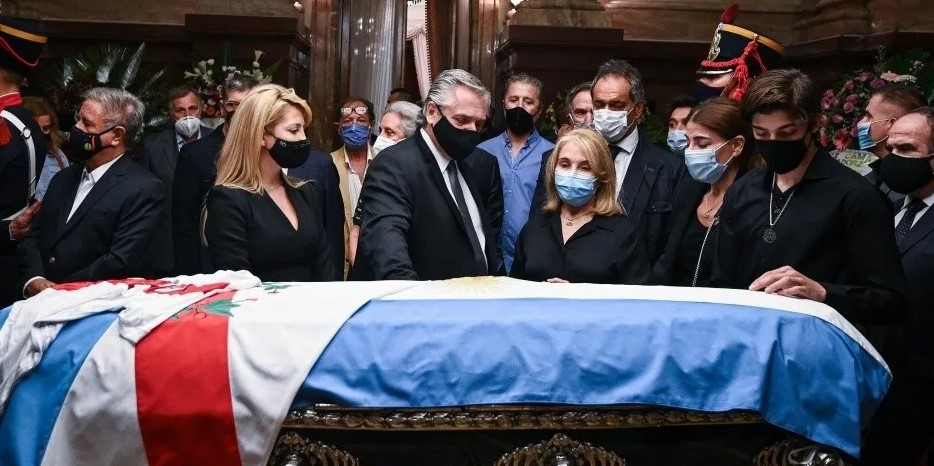Junto a la primera dama Fabiola Yañez, Fernández se acercó al féretro y saludó a la familia que se encuentra despidiendo los restos que este lunes serán inhumados en el cementerio islámico de San Justo, donde descansan también los restos de su hijo Carlos Menem Jr.