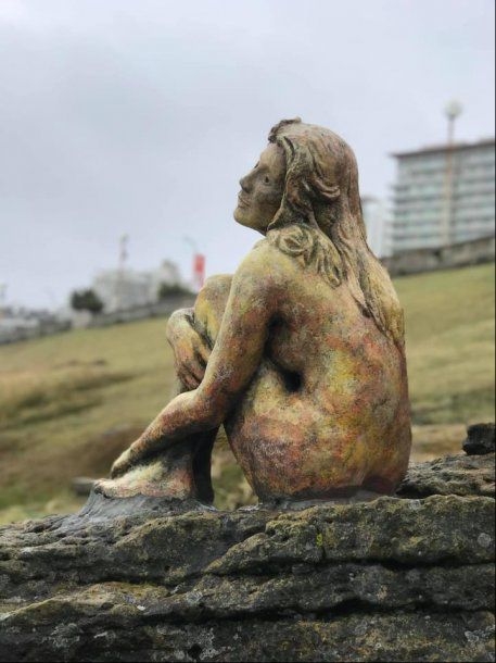 La obra de cemento retrata a una mujer sentada desnuda con uno de sus brazos rodeando sus piernas. Fue colocada en el paseo costero de Playa Chica en Mar del Plata y se desconoce quién es su autor.