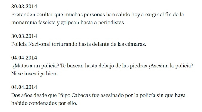 En otro de los mensajes, de marzo de 2014, el rapero, cuyo nombre real es Pau Rivadulla Duró, afirmó: “Pretenden ocultar que muchas personas han salido hoy a exigir el fin de la monarquía fascista y golpean hasta a los periodistas”.