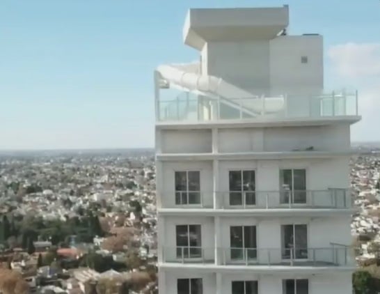 "La idea principal, más allá de lo estético, era darle un toque, revalorizar el barrio y al partido de Lomas de Zamora. No sé si se va a utilizar mucho como tobogán, es más el moño final del edificio, la frutilla de la terraza, algo distintivo", explicó Ezequiel Zelayeta, dueño de la desarrolladora que llevó a cabo el proyecto.