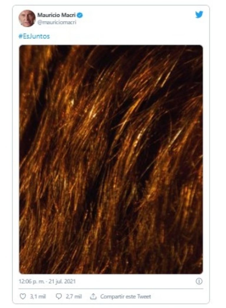 El ex presidente Mauricio Macri realizó un enigmático posteó en su muro de Twitter una imagen de un pelo rojizo junto al hashtag "EsJuntos". Se abrieron una serie de interrogantes entre sus seguidores sobre el significado y, por el otro, muchas bromas.