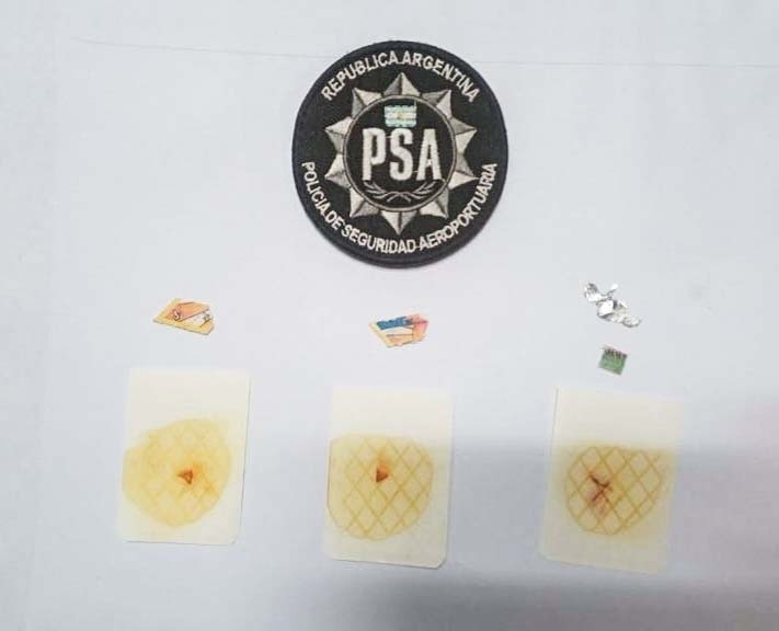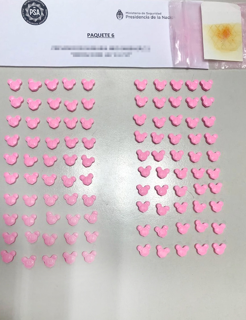 Por orden del juzgado interviniente, el personal policial requisó al hombre y a su equipaje, hallando que, efectivamente, transportaba tres paquetes más de comprimidos rosados con forma del personaje Mickey Mouse, ocultos entre dos calzoncillos que llevaba puestos. Además, tenía en su billetera cartones de LSD y una bolsita con aparente sustancia “cristal”.