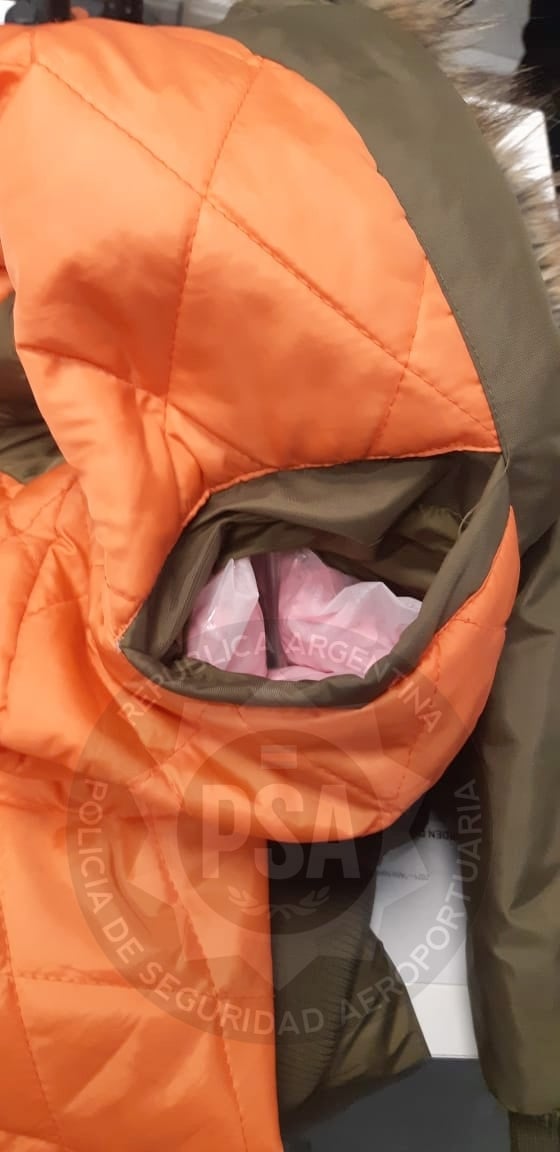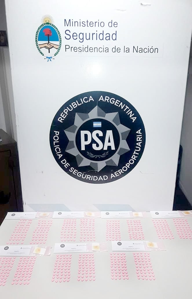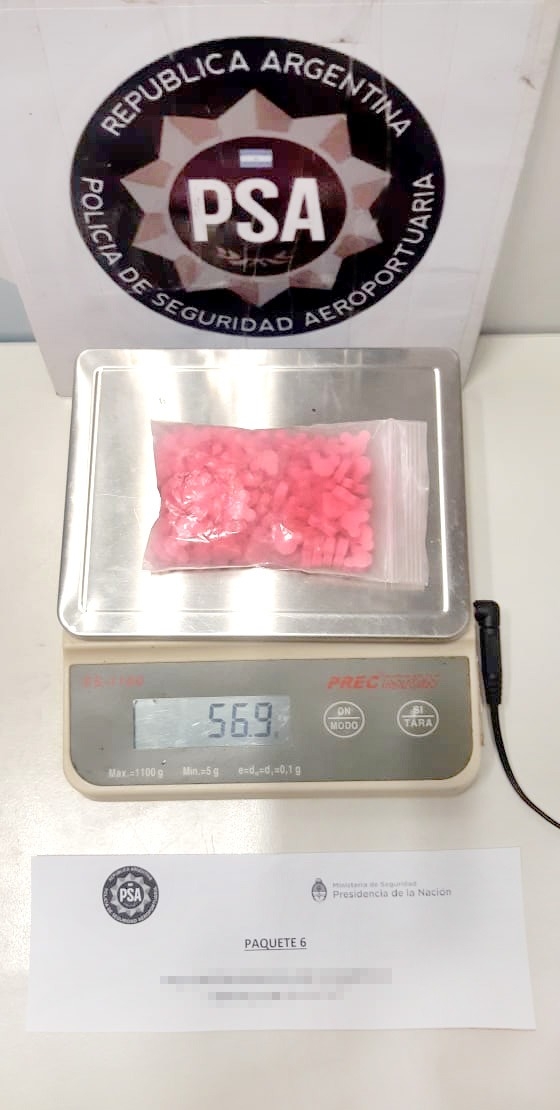 Durante los controles preventivos realizados la semana pasada a los pasajeros próximos a embarcar el vuelo N° 5190 de la empresa Flybondi con destino a la provincia de Jujuy, los oficiales de la PSA observaron la presencia de cuatro paquetes de sustancia orgánica en el interior de un abrigo que, junto a otras pertenencias, había sido colocado en la máquina de rayos X. Al ser consultado, el dueño manifestó que se trataba de pastillas de éxtasis y que llevaba más cantidad en su ropa interior.