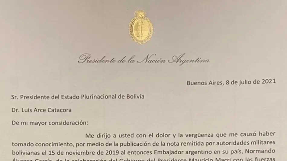 A través de una carta enviada su colega Luis Arce, Fernández pidió disculpas en nombre del "pueblo argentino" después de que "se constatara" en el vecino país que desde Argentina "se remitió una partida de material que no puede ser interpretada sino como un refuerzo a la capacidad de acción de las fueras sediciosas contra la población boliviana en esos días".
