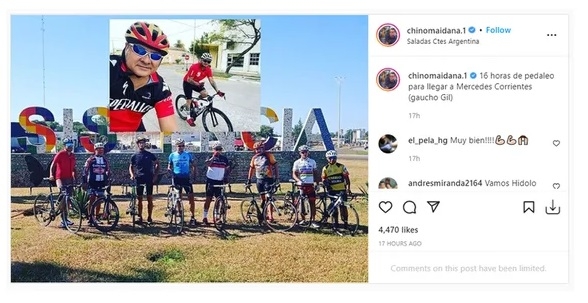 “16 horas de pedaleo para llegar a Mercedes Corrientes (gaucho Gil)”, escribió el púgil santafesino en su cuenta de Instagram, junto a una foto en la que se lo observa acompañado por otros ciclistas que cumplieron sus promesas.