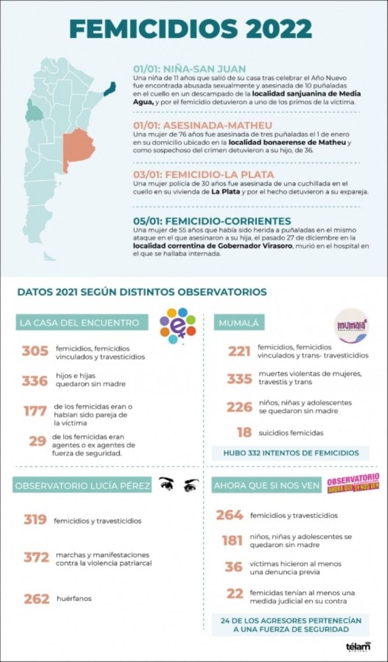 De acuerdo con un reporte elaborado por Télam en base a los hechos dados a conocer por fuentes judiciales y policiales, en los primeros siete días de 2022 hubo cuatro femicidios y un transfemicidio en las provincias de Corrientes, San Juan y Buenos Aires, por los que fueron detenidos tres hombres como acusados.