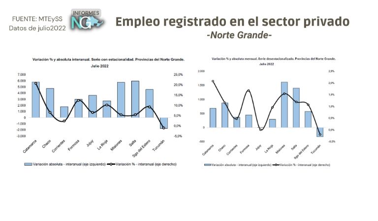 En la comparación interanual (julio 2022 vs igual mes de 2021) tanto el NEA como el NOA exhibieron incrementos del empleo privado formal: en el primer caso, el crecimiento fue del 5,5% (tercero más alto del país) que equivale a la creación de 15.339 puestos de trabajo en el último año; el NOA, por su parte, exhibió una suba del 4,8% (+21.023 empleos) ubicándose quinto a nivel país.