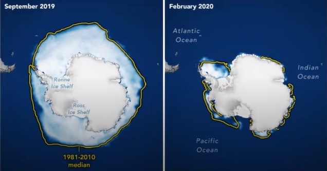 Pero la extensión del hielo marino antártico registró la superficie de hielo más baja en el registro iniciado en 1979 y que contabiliza 44 años. Científicos comprobaron que el hielo marino en la Antártida ha alcanzado el 21 de febrero su extensión más reducida desde que se iniciaron las mediciones por satélite. La superficie helada alrededor del continente de la Antártida es inferior al récord establecido anteriormente, en marzo de 2017, de 2,1 millones de kilómetros cuadrados y ha caído a 1,966 millones de kilómetros cuadrados.