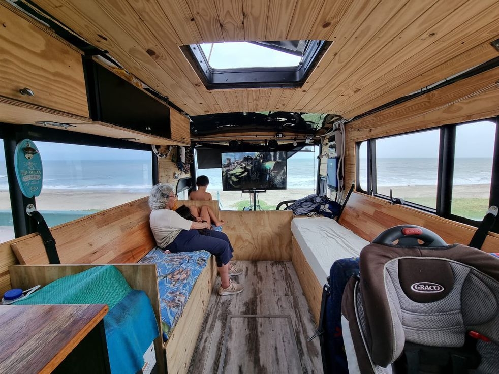 La familia viaja a bordo de “Chimuelo”. Al nombre lo eligieron los chicos, por la película “Entrenando a tu dragón”. Según contó Martín, pensaron y diseñaron mucho el vehículo. “Tiene bastante espacio. En la parte de abajo están los tanques de agua, mesas y reposeras. En la parte de arriba lo cotidiano. Una gran habitación donde mi mujer y yo hacemos colecho con los tres más chiquitos, dos cuchetas y una cama elevada para mi suegra”, explicó.