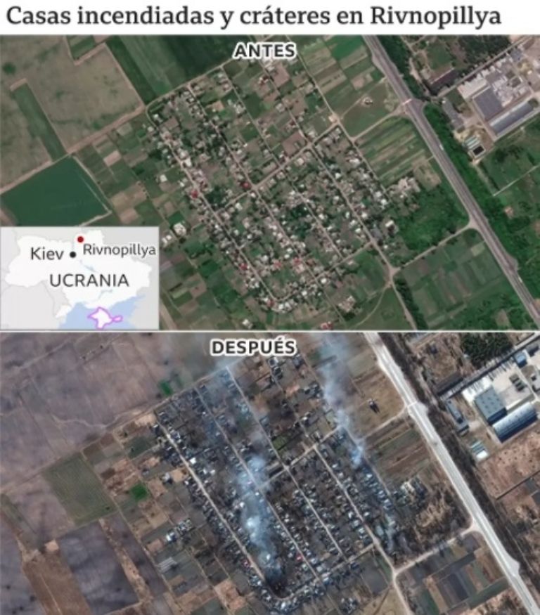 Las imágenes satelitales del pueblo cercano de Rivnopillya, que se encuentra justo al norte de Chernígov, muestran cráteres en el suelo y humo saliendo de las casas en llamas después de los ataques con misiles de las fuerzas rusas.