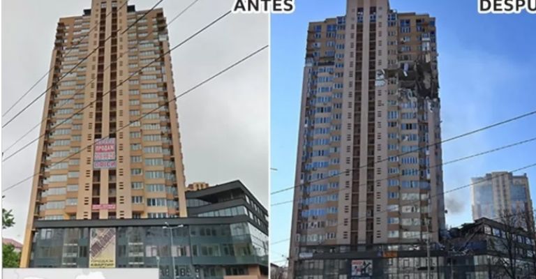 El bloque de departamentos de estas imágenes fue alcanzado por un misil ruso en las primeras horas del sábado pasado: