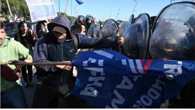 Efectivos de la Policía de la Ciudad y de la Policía de Seguridad Aeroportuaria, intentaban que los manifestantes habilitasen al menos un carril para posibilitar que los pasajeros pudiesen acceder al hall de Aeroparque, en un día particularmente complicado debido al importante movimiento que se registra como consecuencia de Semana Santa.