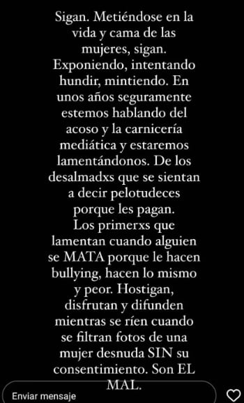 En sus historias de Instagram, la China le respondió al jefe comunal. “Señor intendente, póngase a trabajar en vez de perder el tiempo consumiendo mentiras. Y discúlpese conmigo por difundir algo que no es cierto. Ya estamos grandes para el ‘le dijo que dijiste que me dijo que dijo’. Basta”, exclamó.