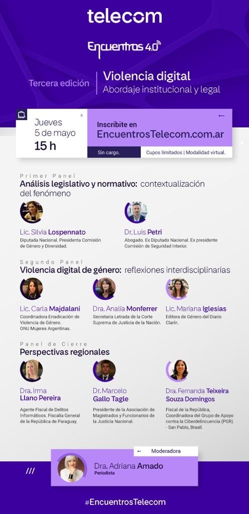 Con la conducción de Adriana Amado, en esta oportunidad el ciclo contará con la presencia de importantes personalidades del ecosistema legislativo: Silvia Lospenatto y Luis Petri aportarán el estado de situación de las iniciativas legislativas; Carla Majdalani, Analía Montferrer y Mariana Iglesias compartirán los desafíos que existen en el tratamiento de la violencia digital de género; mientras que Fernanda Teixeira Sousa Domingos (Brasil), Irma Llano Pereira (Paraguay) y Marcelo Gallo Tagle ofrecerán una perspectiva regional sobre este escenario de delito digital.