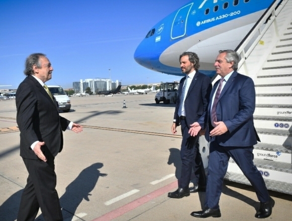 Lo acompañan el canciller Santiago Cafiero; los secretarios de Relaciones Económicas Internacionales, Cecilia Todesca; de Asuntos Estratégicos, Gustavo Beliz; el secretario general de la Presidencia, Julio Vitobello, y la portavoz Gabriela Cerruti.