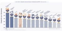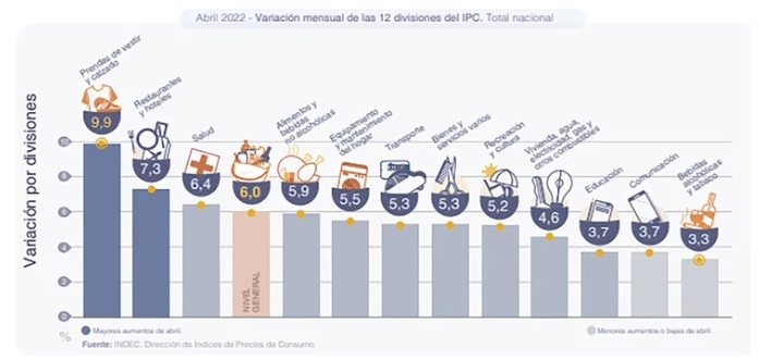 Por debajo del 9,9% de la indumentaria, los aumentos de abril desagregados por sector fueron Restaurantes y Hoteles (7,3%), Salud (6,4%), Alimentos y bebidas no alcohólicas (5,9%), Equipamiento y mantenimiento del hogar (5,5%), Transporte (5,3%), Recreación y cultura (5,2%), Vivienda, agua, electricidad, gas y otros combustibles (4,6%), Educación (3,7%), Comunicación (3,7%) y Bebidas Alcohólicas y tabaco (3,3%).