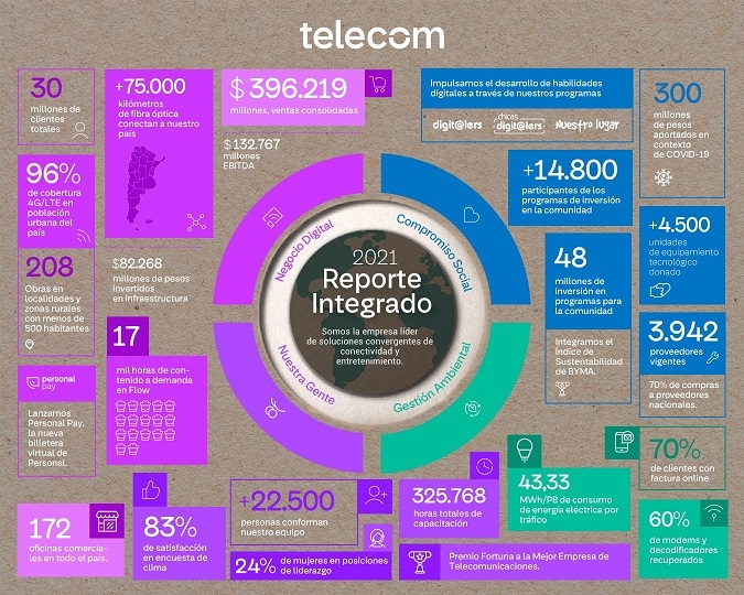 Entre otras líneas de trabajo, el Reporte da cuenta de la evolución que Telecom está atravesando para pasar de ser una empresa de telecomunicaciones a convertirse en una empresa de servicios digitales que, basada en la conectividad, impulsa la economía digital y potencia la vida de personas, comunidades y empresas. En consonancia con esta evolución, durante 2021 Telecom renovó su identidad visual institucional y la de sus marcas comerciales: Personal, para los servicios de conectividad, Flow, como punto de encuentro del entretenimiento, y Telecom, para continuar acercando soluciones digitales al segmento corporativo y de gobierno, y seguir contribuyendo a su desarrollo y crecimiento.