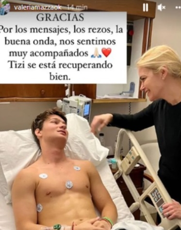 Durante su relato, Gravier contó que junto a Valeria estuvieron al lado de Tiziano desde que recibieron la noticia a las 5 de la mañana del domingo hasta las primeras horas de la tarde del miércoles cuando el joven salió de la operación. Y al poco tiempo, la modelo publicó una fotografía junto a su hijo desde el interior de la habitación. “Gracias. Por los mensajes, los rezos, la buena onda. Nos sentimos muy acompañados. Tizi se está recuperando bien”, escribió Valeria junto a un emoji de corazón y otro de las manos juntas en forma de rezo. En la imagen, se la ve sonriente, mirando la evolución de su hijo que descansa en la habitación del hotel luego de la operación.
