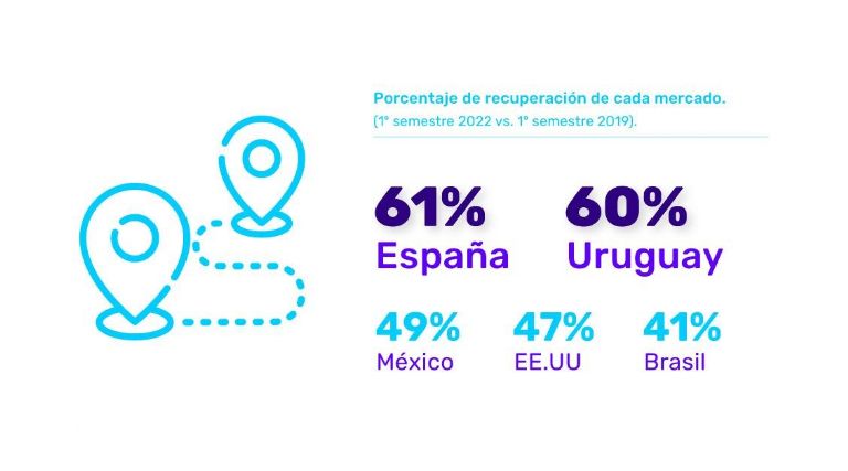 En ese sentido, el ranking de porcentaje de recuperación de cada mercado comparado con el mismo período de la prepandemia (1º semestre de 2022 vs. 1º semestre de 2019), muestra que el primer lugar lo ocupa España con un 61% de recuperación, le siguen Uruguay con un 60%; México con 49%, Estados Unidos con el 47% y Brasil con el 41%.