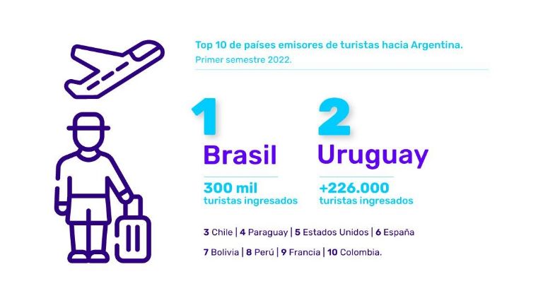 El top 10 de los países emisores de turistas de este primer semestre de 2022 lo integran, en ese orden, Brasil (que ya llegó a los 300 mil turistas ingresados), Uruguay (superó los 226.000 turistas), Chile, Paraguay, Estados Unidos, España, Bolivia, Perú, Francia y Colombia.