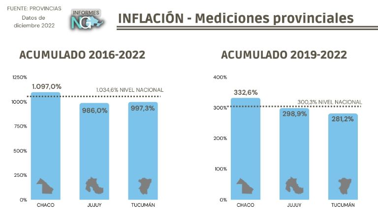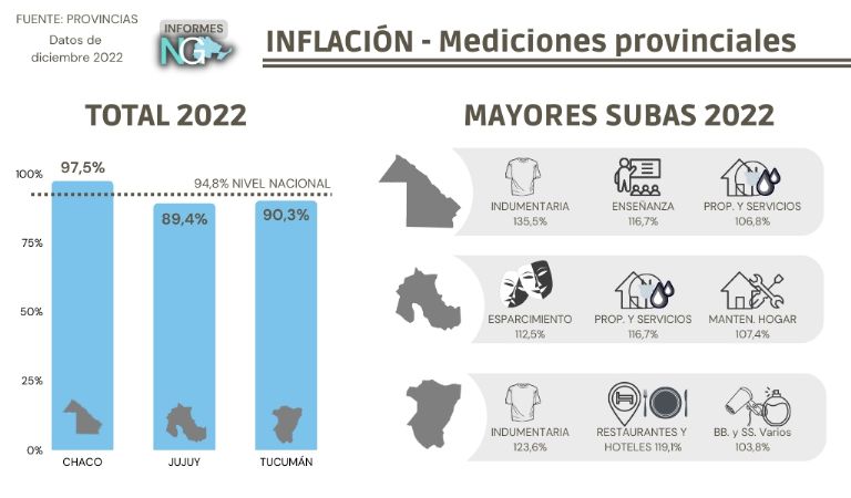 En el Norte Grande, hay solo tres provincias que realizan su propia medición del IPC y en todas se observa el mayor nivel de suba de las últimas tres décadas. En el Chaco, el 2022 cerró con una suba del 97,5%, que es la más alta para esa provincia desde 1991. Además, es la más alta de las tres provincias de la macrorregión, ya que en Tucumán el IPC local cerró el año en 90,3% y en Jujuy marcó 89,4%. Por ende, Chaco es a su vez la única provincia del norte con niveles de suba superiores al total nacional medido por INDEC (que fue de 94,8%).