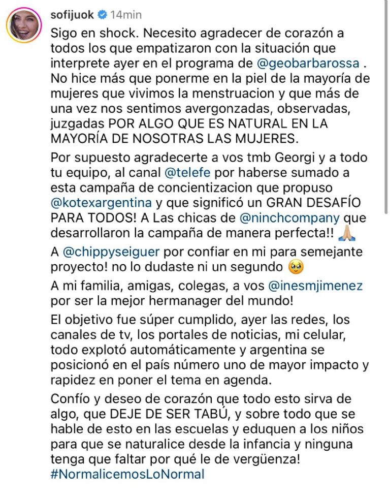 Pero, cuando casi todo el país estaba hablando de este tema, Sofía salió a aclarar en su cuenta de Instagram que todo había sido una simulación para concientizar a la sociedad sobre la menstruación, es decir armaron tremenda campaña junto a "Kotex". Si bien es una campaña de concientización, también se llevaron el premio a mejor publicidad de la marca, eso es obvio.